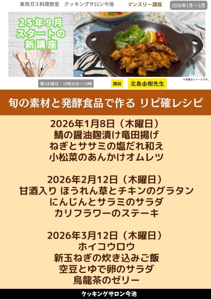 旬の素材や甘酒・塩麹などの発酵食品を使い、本当に“リピートしたくなる”やみつきレシピを習得する新講座。imaikeミニサロンの特別空間で、少人数制ならではのきめ細やかな指導を受けながら、毎月変わる旬の味わいを自宅で再現できる技術とコツを身につけましょう!