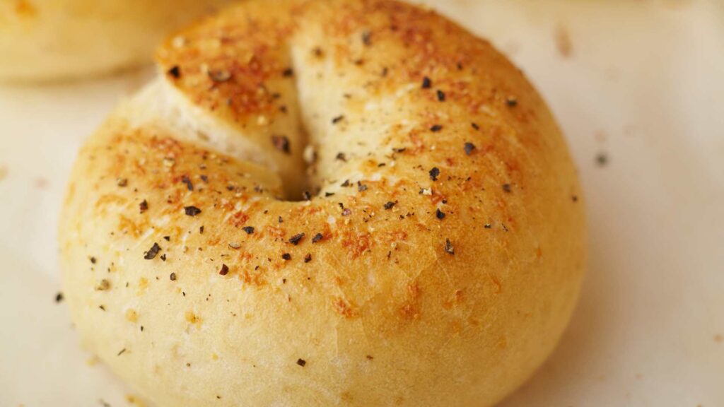 「ベーグル」は、ゆでてから焼き上げる工程をもつパンの種類です。ペッパーを加えることで、風味にアクセントをつけた仕立てになります。